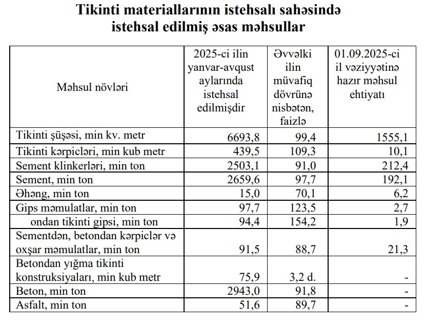 "Tikinti materiallarının istehsalı sahəsində 2025-сi ilin yanvar-avqust aylarında istehsalın ümumi dəyəri 911,6 milyon manat olmaqla, əvvəlki ilin müvafiq dövrü ilə müqayisədə 4,2 faiz azalmışdır. Dövr ərzində sementin istehsalı 2,3 faiz, betonun istehsalı 8,2 faiz, asfaltın istehsalı 10,3 faiz, sementdən, betondan kərpiclər və oxşar məmulatlarının istehsalı 11,3 faiz, əhəngin istehsalı isə 29,9 faiz azalmışdır",- hesabatda bildirilir.