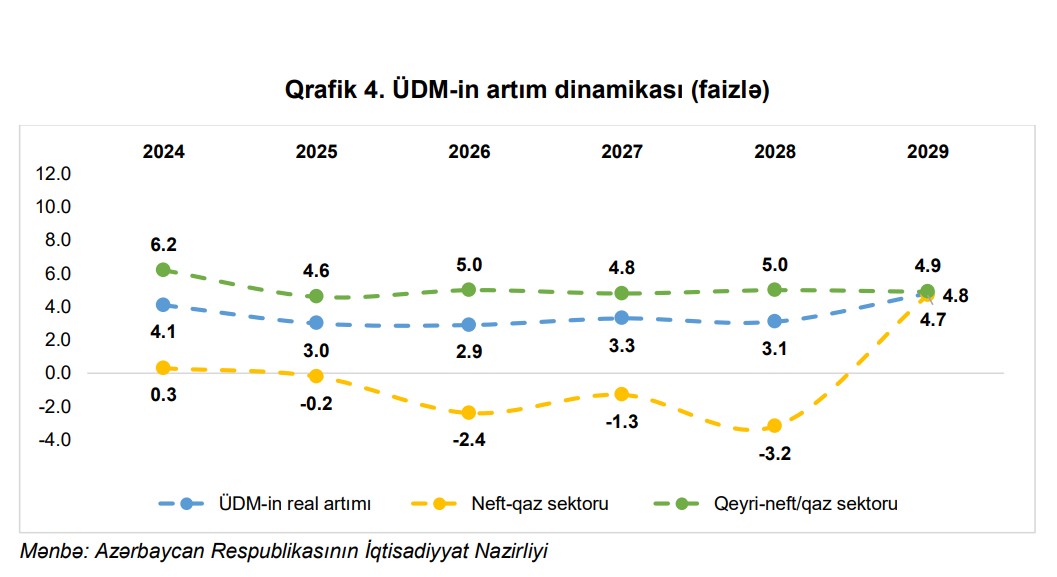 Ortamüddətli dövrdə ÜDM-in real artım tempinin orta illik 3,5 faiz, qeyri-neft-qaz ÜDM-in isə 4,9 faiz olacağı proqnozlaşdırılır.