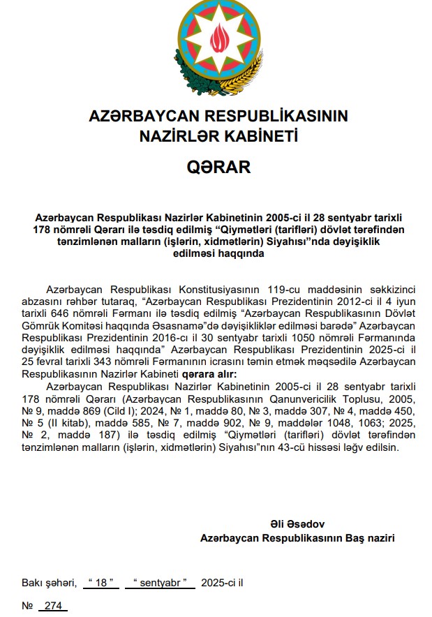 Nazirlər Kabineti 28 sentyabr 2005-ci il tarixli qərarı ilə təsdiq edilmiş "Qiymətləri (tarifləri) dövlət tərəfindən tənzimlənən malların (işlərin, xidmətlərin) Siyahısı"na dəyişiklik edib.