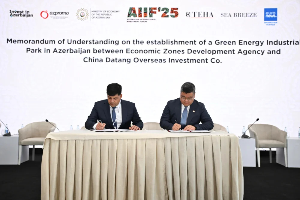 İqtisadi Zonaların İnkişafı Agentliyi ilə "China Datang Overseas Investment Co." arasında Abşeron yarımadasında Yaşıl Enerji Sənaye Parkının yaradılması üzrə Anlaşma Memorandumu imzalanıb. Bu əməkdaşlıq bərpaolunan enerji istehsalı, təmiz texnologiyalar və sənaye infrastrukturunun inkişafı sahəsində uzunmüddətli tərəfdaşlığı nəzərdə tutur. Sənədi İqtisadi Zonaların İnkişafı Agentliyinin İdarə Heyətinin sədri Seymur Adıgözəlov və “China Datang Overseas Investment Co.” şirkətinin baş direktoru Yuanlong Zhou imzalayıblar.