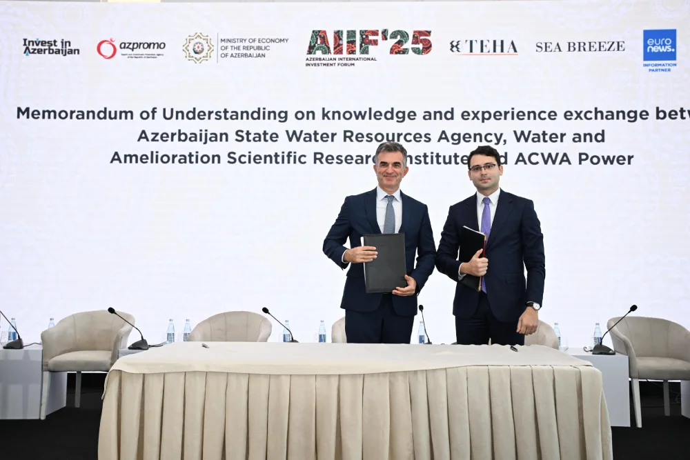 Su və Meliorasiya Elmi-Tədqiqat İnstitutu ilə ACWA Power şirkəti arasında birgə bilik və təcrübə mübadiləsinə dair Anlaşma Memorandumu imzalanıb Sənədi Su və Meliorasiya Elmi-Tədqiqat İnstitutunun İdarə Heyətinin sədri Mir Mövsüm Dadaşov və ACWA Power şirkətinin Azərbaycan və Türkiyə üzrə ölkə üzrə baş meneceri Selim Güvent imzalayıblar.