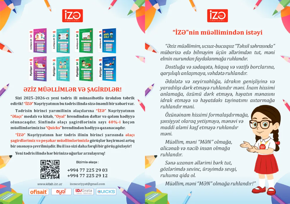 Yeri düşmüşkən qeyd edək ki, bu tədris ili fəaliyyətinin 10 illik yubileyini qeyd edən “İZƏ” Nəşriyyatı dəyərli müəllim, valideyn və şagirdlər üçün daha bir mükəmməl dərs vəsaiti təqdim edir.