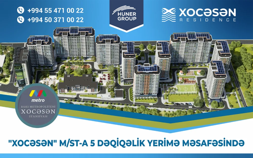 Xocəsən Residence yaşayış kompleksində 30% ilkin ödəniş və daxili kredit şərtlərilə 1, 2, 3 və 4 otaqlı mənzillərə sahib olmaq mümkündür. Ətraflı məlumat üçün 050 371 00 22 və 055 471 00 22 nömrəsi ilə əlaqə saxlaya və ya Huner Group-un Ağ Şəhərdə yerləşən baş ofisini ziyarət edə bilərsiniz.