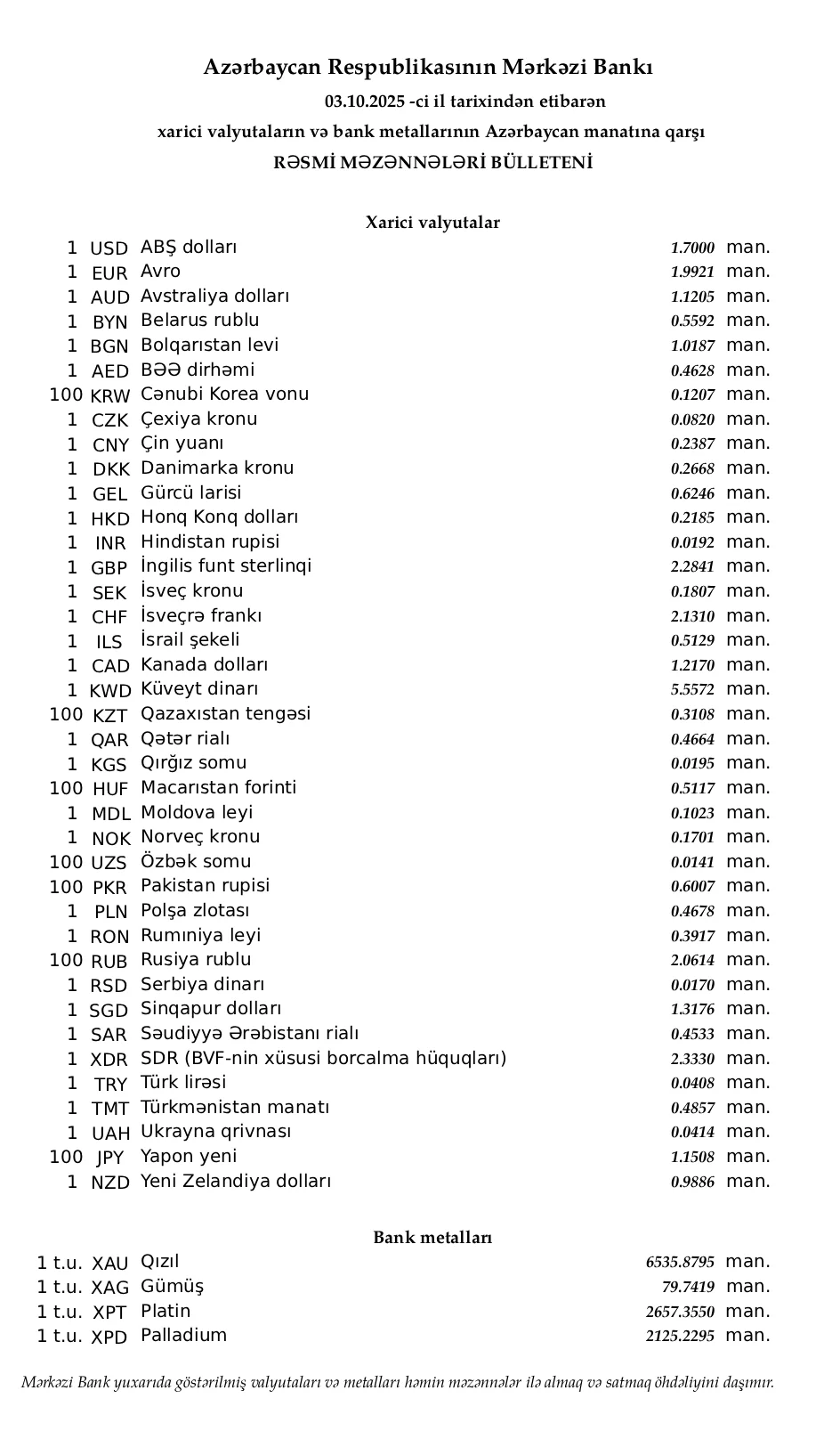 Rəsmi məzənnələr açıqlandı