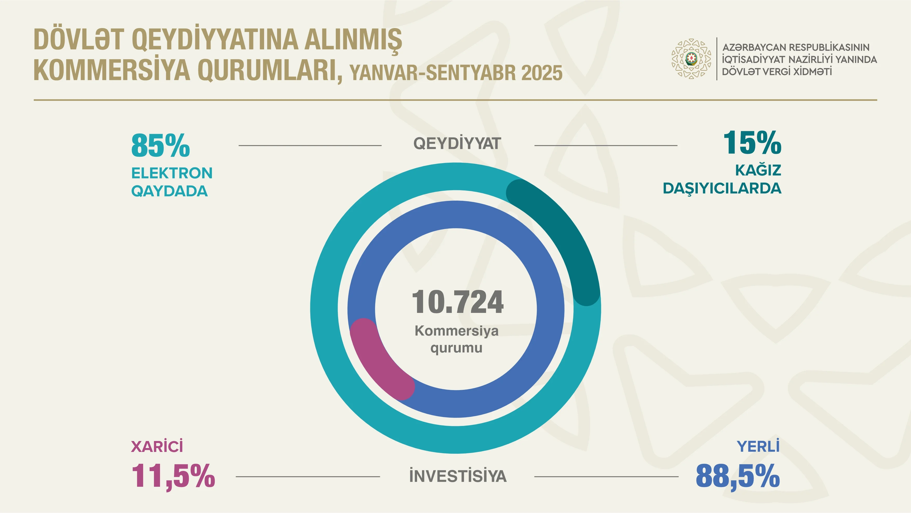 Kommersiya qurumlarının 85 faizi elektron qaydada qeydiyyata alınıb. Yerli investisiyalı məhdud məsuliyyətli cəmiyyətlərin e-qeydiyyatının xüsusi çəkisi isə 96,3 faiz təşkil edib.