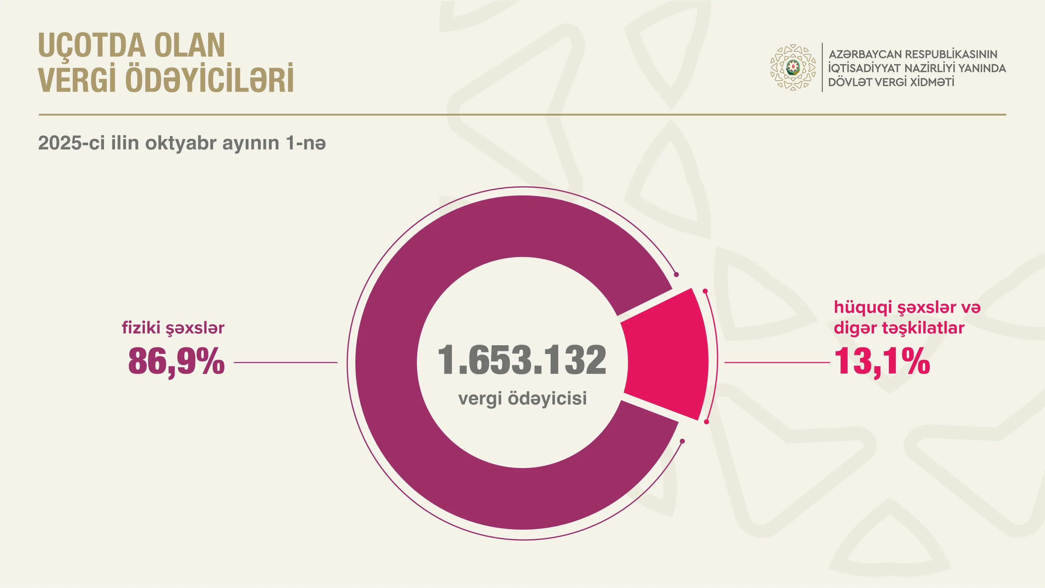 2025-ci ilin oktyabr ayının 1-nə respublika üzrə uçotda olan 1 milyon 653 min 132 vergi ödəyicisinin 86,9 faizi fiziki şəxs, 13,1 faizi hüquqi şəxs və digər təşkilatlar olub.