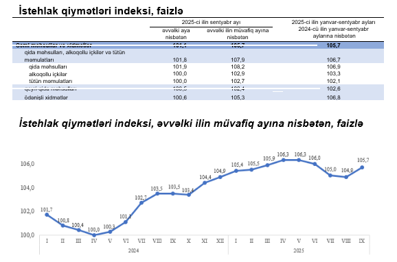 2025-ci ilin sentyabr ayında istehlak qiymətləri indeksi əvvəlki aya nisbətən 1,1 faiz, yanvar-sentyabr aylarında isə əvvəlki ilin müvafiq dövrünə nisbətən 5,7 faiz yüksəlib.