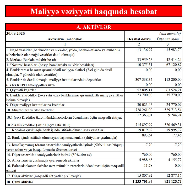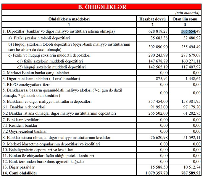 Depozit portfeli isə 565 milyon 654 min manatdan 628 milyon 818 min manata çatıb. Artım 63 milyon 164 min manat və ya 11,2% təşkil edib. Bu, bankın əmanətçilər arasında etibarının artdığını, eyni zamanda müştəri bazasının genişləndiyini göstərir.