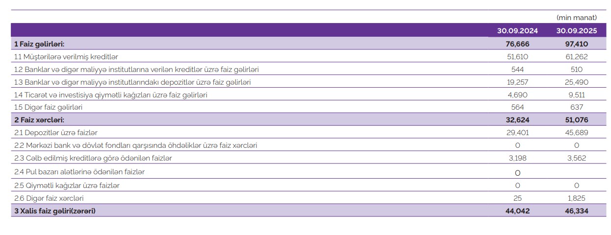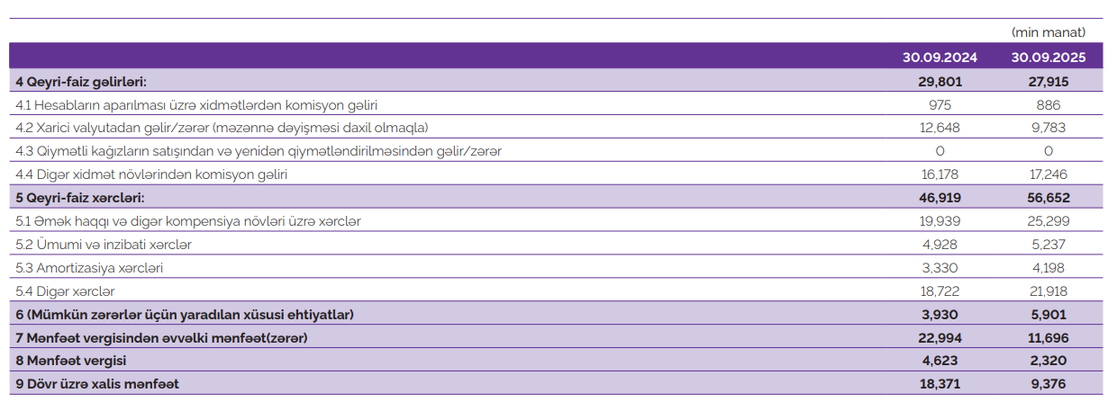 Qeyri-faiz gəlirləri isə 2025-ci ilin yanvar–sentyabrında 27 milyon 915 min manat olmuş, bu isə 2024-cü ilin eyni dövrü ilə müqayisədə 1 milyon 886 min manat və ya 6,3% azalma deməkdir. Qeyri-faiz xərcləri isə 9 milyon 33 min manat və ya 20,7% artaraq 56 milyon 652 min manata yüksəlib.