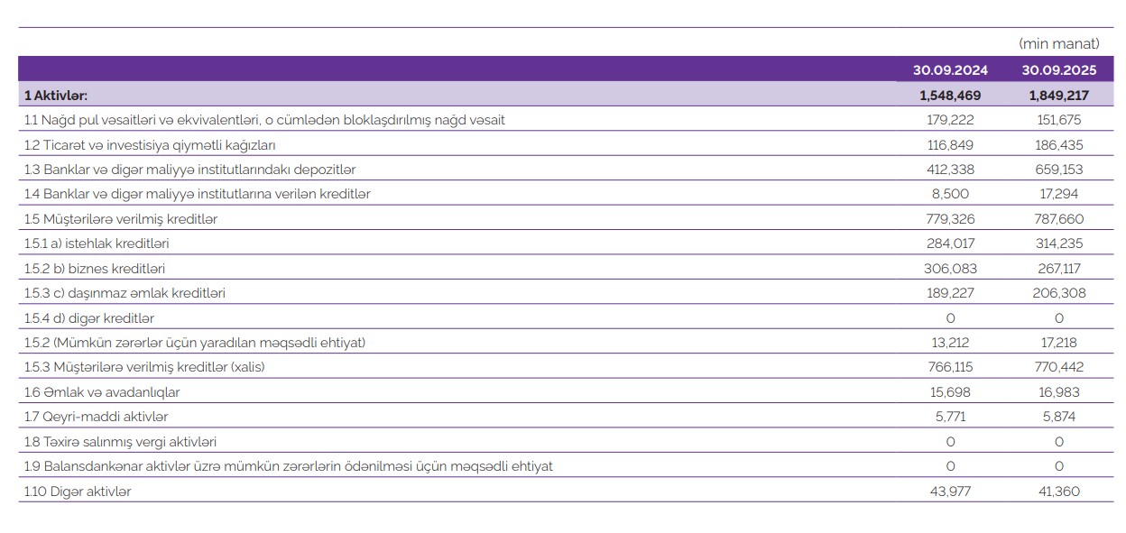Bankın kredit portfeli isə 787 milyon 660 min manat səviyyəsinə çataraq 30 sentyabr 2024-cü il tarixindəki 779 milyon 326 min manat ilə müqayisədə 8 milyon 334 min manat və ya 1,1% artıb.