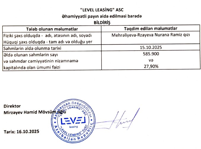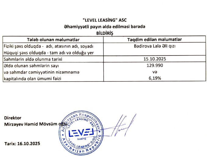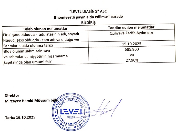 Marja.az məlumatlara istinadən xəbər verir ki, 15 oktyabr 2025-ci il tarixindən etibarən, həmçinin, "Level Leasing"ASC-nin 1 milyon 50 min manat nizamnamə kapitalının 27,90%-i Quliyeva Zərifə Aydın qızına, 27,90%-i Mehrəliyeva-Rzayeva Nuranə Ramiz qızına və 6,19%-i Bədirova Lalə Əli qızına məxsusdur.
