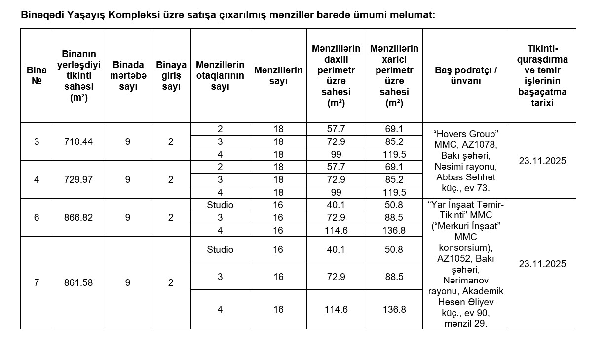 Elanda bildirilir ki, Bakı şəhəri, Suraxanı rayonu, Hövsan qəsəbəsi, Zığ şossesi-Hava Limanı 12-ci km. “22” ünvanında yerləşən Hövsan Yaşayış Kompleksinin birinci mərhələsi üzrə 1 mənzilin, Bakı şəhəri, Suraxanı rayonu, Hövsan qəsəbəsi, Hava Limanı-Zığ şossesi 8-ci km, “10L” ünvanında yerləşən Hövsan Yaşayış Kompleksinin ikinci mərhələsi üzrə 7 mənzilin, Sumqayıt şəhəri, Bulvar küçəsi, 197 ünvanında yerləşən Sumqayıt Yaşayış Kompleksi üzrə 10 mənzilin, Lənkəran şəhəri, Akademik Zərifə Əliyeva küçəsi, 303 ünvanında yerləşən Lənkəran Yaşayış Kompleksi üzrə 10 mənzilin, Bakı şəhəri, Binəqədi rayonu, Binəqədi qəsəbəsi, 10 may küçəsi, 590 saylı sahə ünvanında yerləşən Binəqədi Yaşayış Kompleksi üzrə 204 mənzilin, Şirvan şəhəri, Naxçıvan küçəsi, 58A ünvanında yerləşən Şirvan Yaşayış Kompleksi üzrə 216 mənzilin, Yevlax şəhəri, Rəşad Budaqov küçəsi, 1 ünvanında yerləşən Yevlax Yaşayış Kompleksi üzrə 179 mənzilin, ümumilikdə 627 mənzilin satışı 3 dekabr 2025-ci il tarixində saat 11:00-da başlayacaq və 12 dekabr 2025-ci il tarixi saat 11:00-dək davam edəcəkdir.