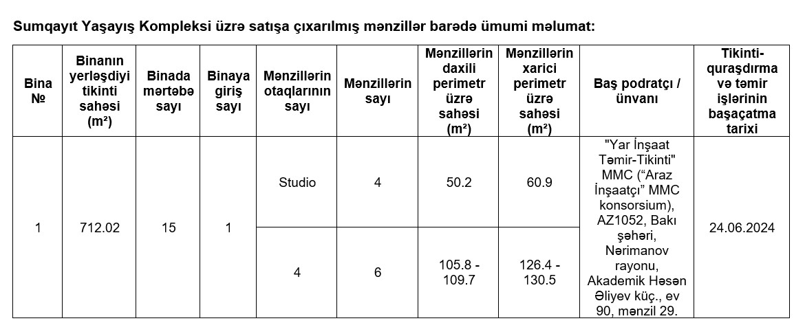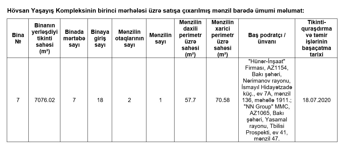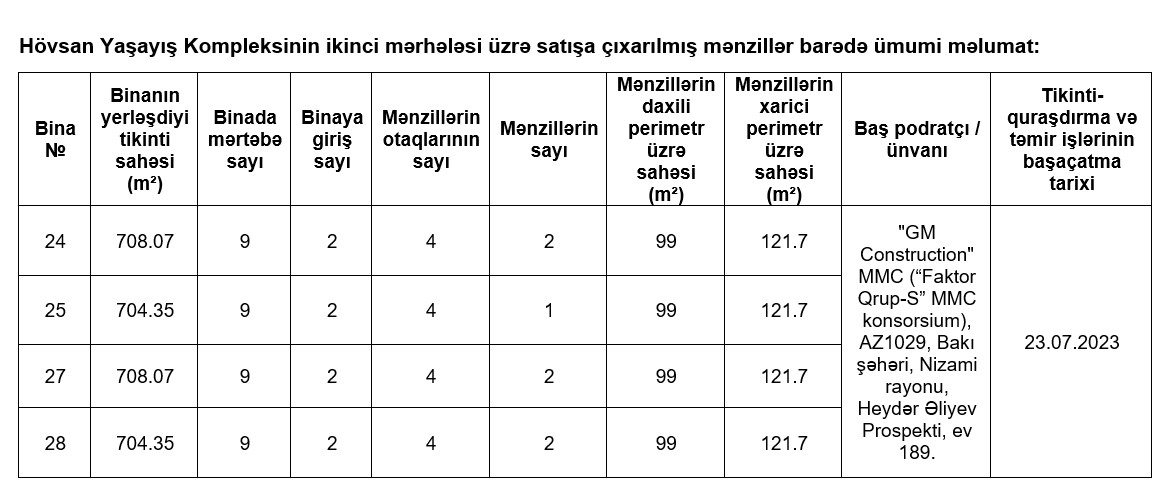 Satışa Hövsan Yaşayış Kompleksinin birinci mərhələsi üzrə 1, Hövsan Yaşayış Kompleksinin ikinci mərhələsi üzrə 7, Sumqayıt Yaşayış Kompleksi üzrə 10, Lənkəran Yaşayış Kompleksi üzrə 10, Binəqədi Yaşayış Kompleksi üzrə 204, Şirvan Yaşayış Kompleksi üzrə 216, Yevlax Yaşayış Kompleksi üzrə 179 mənzil olmaqla, ümumilikdə 627 mənzil çıxarılır. Bütün mənzillər tam təmirli, mətbəx mebeli, kombi isitmə sistemi (kombi cihazı daxil olmaqla), su, qaz və elektrik sayğacları ilə təmin edilmiş vəziyyətdə təklif olunur.