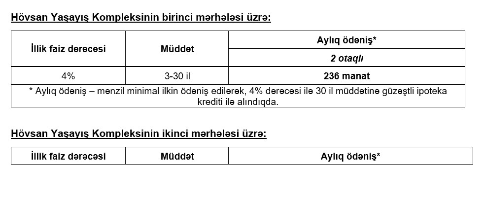 Bu elan çərçivəsində mənzillərin satışı həm ipoteka kreditindən istifadə etməklə, həm də öz vəsaiti hesabına ödəniş üsulu ilə nəzərdə tutulmuşdur.