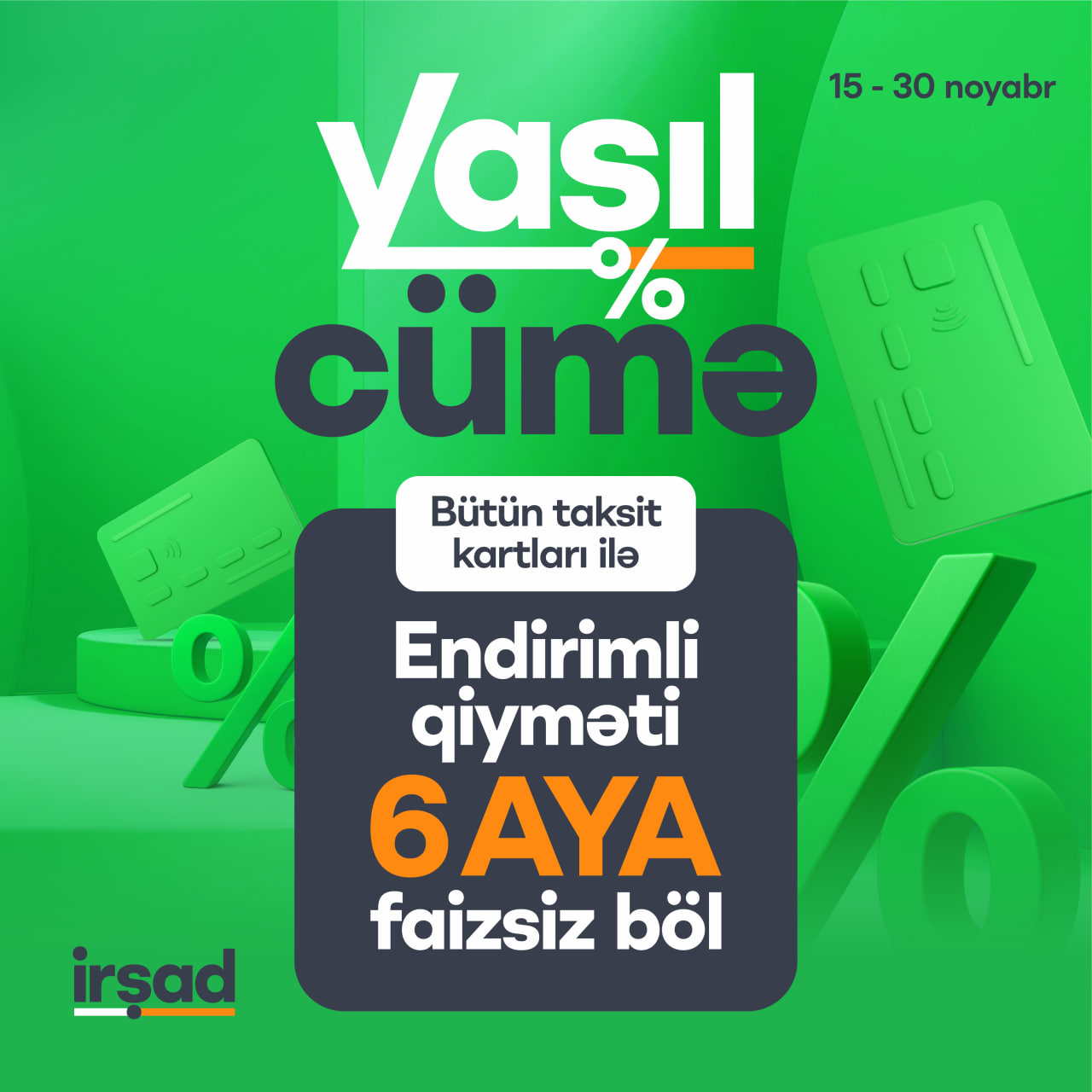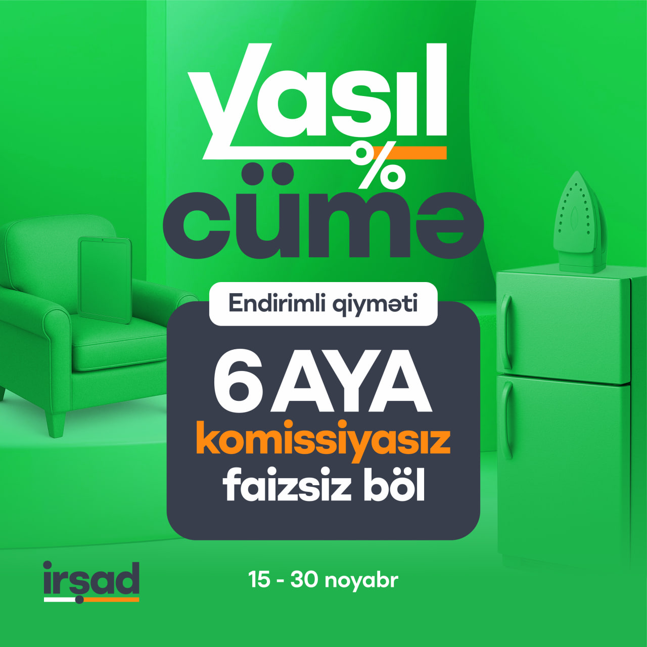 "Yaşıl Cümə" kampaniyası çərçivəsində "Irshad" mağazalar şəbəkələrində və onlayn satış platformalarında müştərilərə ev və şəxsi istifadə üçün elektronika, məişət texnikası, mebellər, smartfonlar və aksessuarlar 70%-ə qədər böyük endirimlə təqdim olunur.