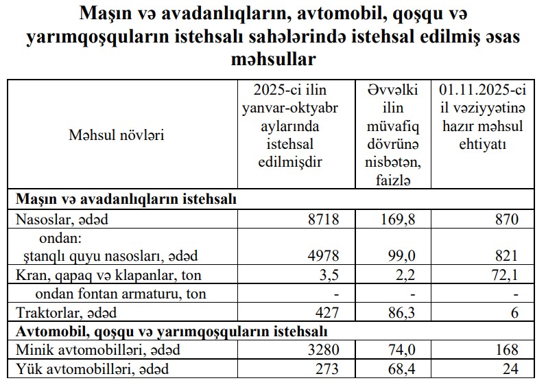 Yanvar-oktyabr aylarında əvvəlki ilin müvafiq dövrü ilə müqayisədə traktorların istehsalı 13,7 faiz azalaraq 427 ədəd, yük avtomobillərinin istehsalı isə 31,6 faiz azalaraq 273 ədəd təşkil edib.