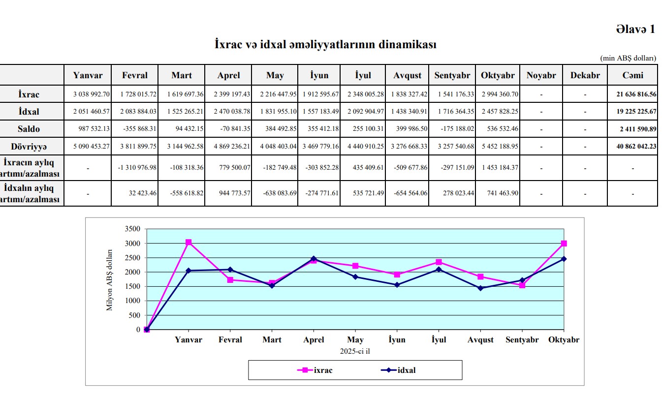 01.01.2025 – 31.10.2025-ci il dövründə (cari ilin 10 ayı ərzində) Azərbaycanın xarici ticarət əməliyyatlarının həcmi 40 milyard 862 milyon 42 min dollar təşkil edib.