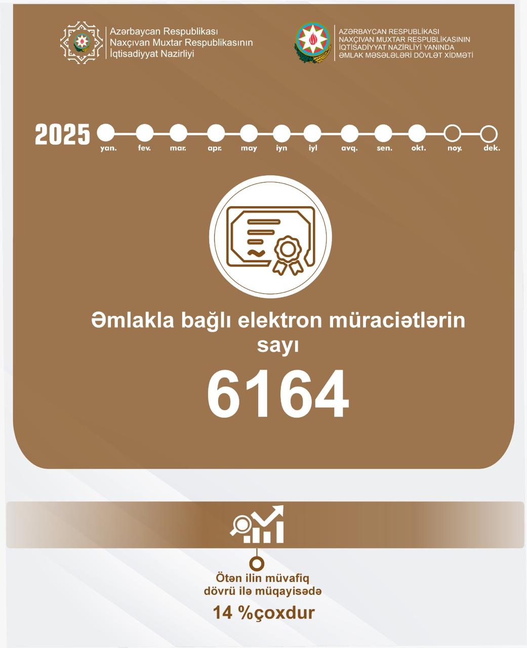 2025-ci ilin yanvar-oktyabr ayları ərzində Naxçıvan Muxtar Respublikasının İqtisadiyyat Nazirliyi yanında Əmlak Məsələləri Dövlət Xidməti tərəfindən 8635 daşınmaz əmlak üzərində mülkiyyət hüququnun qeydiyyatı aparılıb.