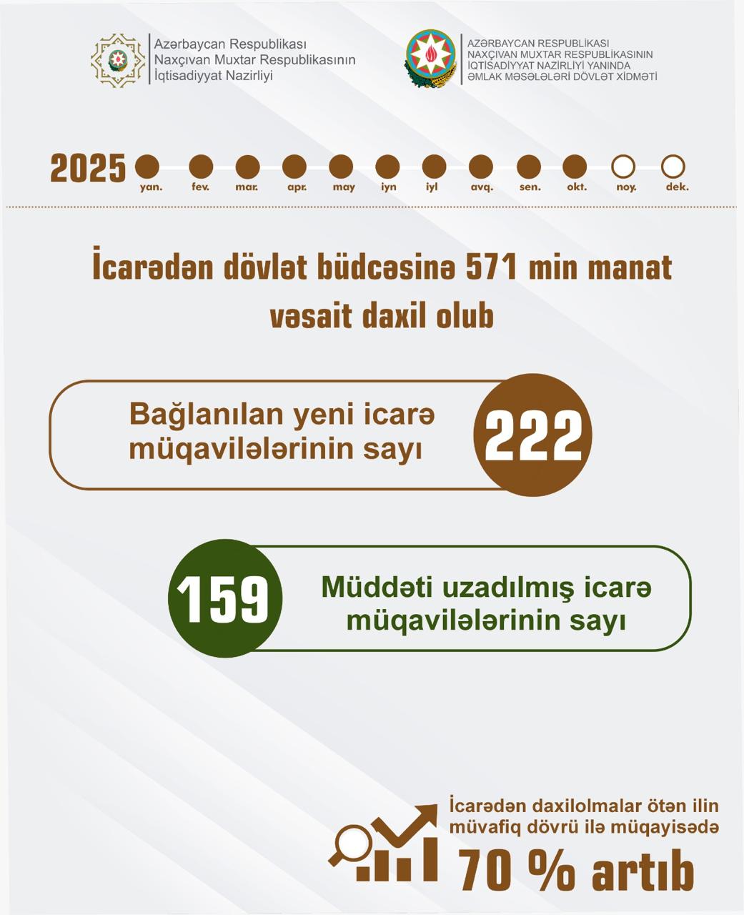 2025-ci ilin yanvar–oktyabr aylarında Naxçıvan Muxtar Respublikasında dövlət mülkiyyətində olan əmlakların icarəyə verilməsi sahəsində işlər davam etdirilib.