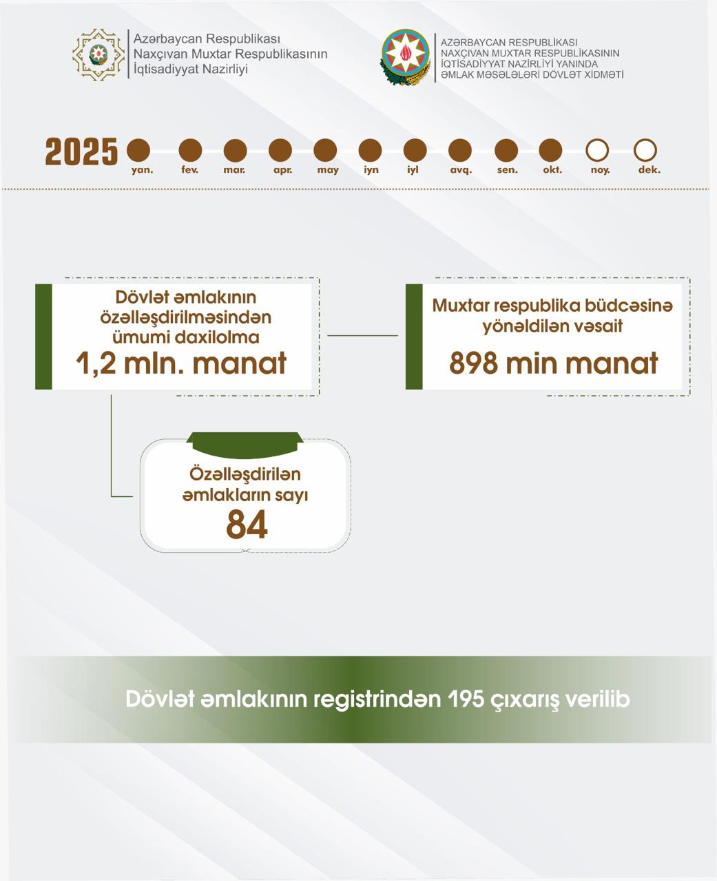 2025-ci ilin yanvar–oktyabr aylarında Naxçıvan Muxtar Respublikasında 84 dövlət əmlakı özəlləşdirilib.