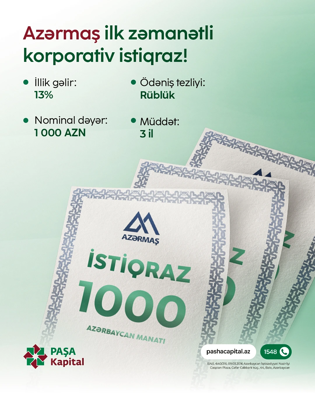 (®) PAŞA Kapital İnvestisiya Şirkətinin anderrayterliyi ilə ölkədə ilk dəfə olaraq zəmənatli korporativ istiqraz buraxılışına start verilib.