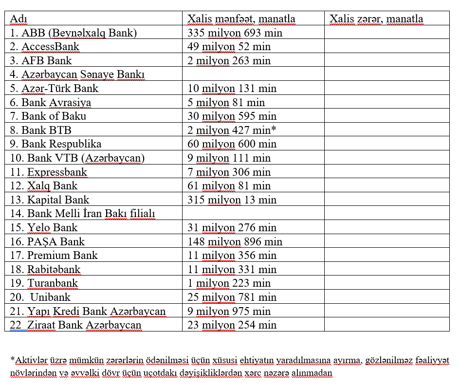 Bankların adları və mənfəət məbləğləri ilə aşağıdakı cədvəldən tanış ola bilərsiniz.