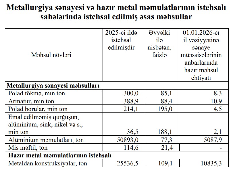 2025-сi ildə metallurgiya sənayesi üzrə armatur istehsalı 11,6 faiz, polad tökmə istehsalı 14,9 faiz, mis məftil istehsalı 78,6 faiz, hazır metal məmulatlarının istehsalı sahəsi üzrə metaldan sair məmulatların istehsalı isə 29,8 faiz azalıb.