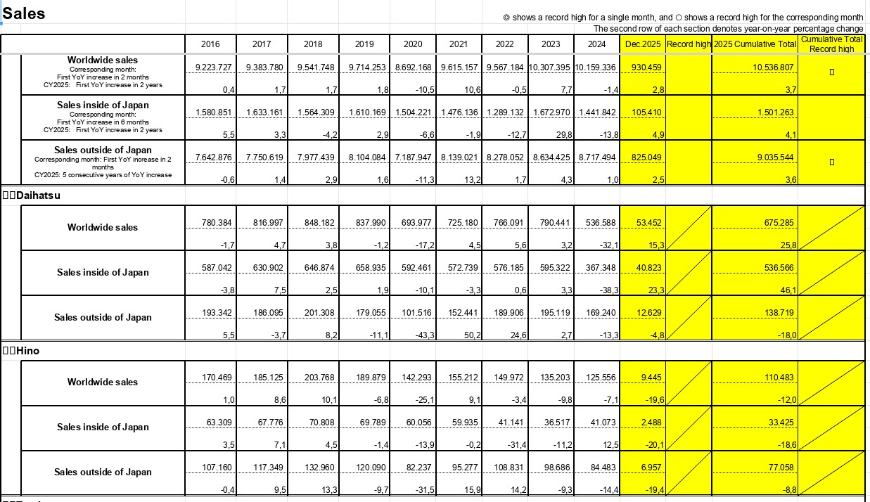 Toyota və Lexus markalı avtomobillərin 2025-ci il satışları 3,7 faiz artaraq 10,5 milyon ədədə çatıb. Bu yüksəlişdə xüsusilə ABŞ-da hibrit avtomobillərə güclü tələb rol oynayıb.