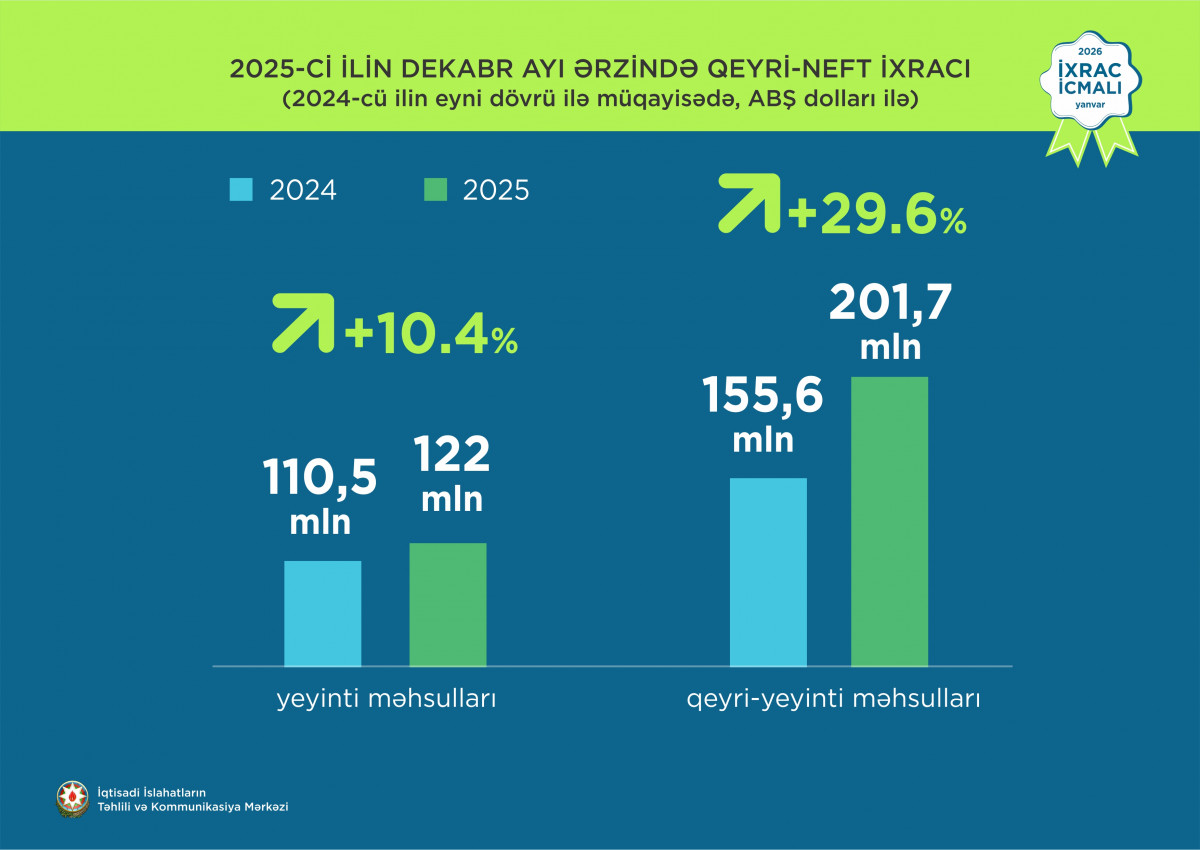 2025-ci ilin dekabr ayında Rusiya Federasiyasına 96,3 milyon ABŞ dolları, Türkiyəyə 51,2 milyon ABŞ dolları, Gürcüstana 41,4 milyon ABŞ dolları, İsveçrəyə 32,9 milyon ABŞ dolları, Ukraynaya isə 10,8 milyon ABŞ dolları dəyərində qeyri-neft sektoruna aid mal ixrac edilib.