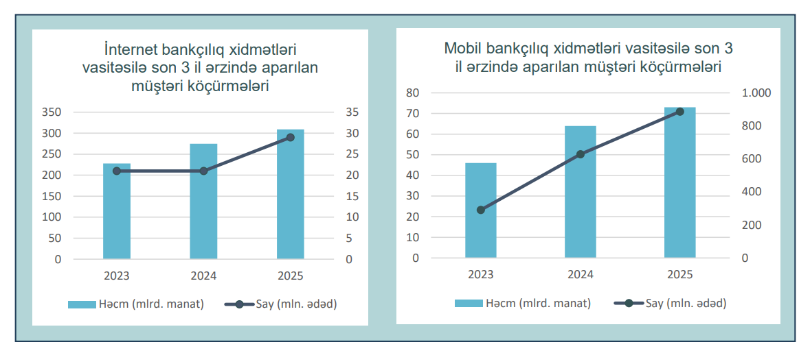 2025-ci il ərzində internet bankçılıq xidmətləri vasitəsilə aparılan müştəri köçürmələrinin həcmi 2024-cü illə müqayisədə 12.4% artaraq 308.9 mlrd. manat, mobil bankçılıq xidmətləri vasitəsilə aparılan müştəri köçürmələrinin həcmi isə 14.3% artaraq 73 mlrd. manat olmuşdur.