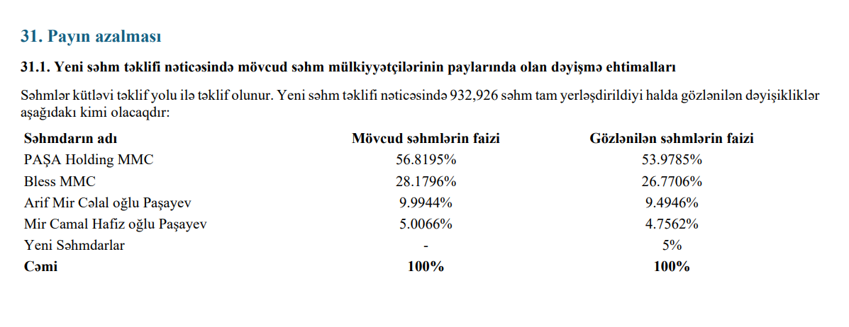 Belə ki, səhmlərin 56,82 %-nə nəzarət edən "PAŞA Holdinq" MMC-nin payının 53,98 %-ə, 28,18 %-nə nəzarət edən "Bless" MMC-nin payının 26,77 %-ə, 9,99 %-nə nəzarət edən Arif Paşayevin payının 9,49 %-ə, 5,01 %-nə nəzarət edən Mircamal Paşayevin (Bankın Müşahidə Şurasının sədri) payının isə 4,76 %-ə düşə biləcəyi ehtimal olunur.