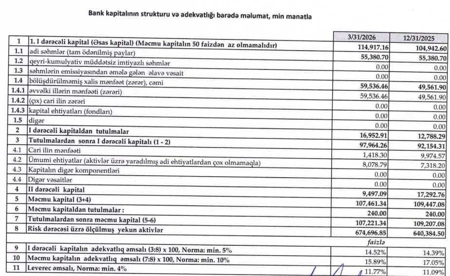 2026-cı ilin ilk rübünün sonuna bankın depozit portfeli 503 milyon 225 min manat təşkil edib. Bu göstərici 2025-ci ilin sonu ilə müqayisədə 24 milyon 518 min manat və ya 4,6 % azdır. 2025-ci ilin sonunda depozit portfeli 527 milyon 743 min manat idi.