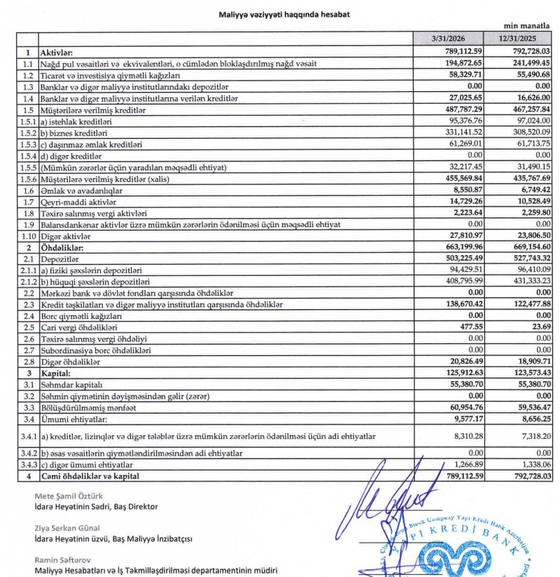"Yapı Kredi Bank Azərbaycan" QSC 2026-cı ilin ilk rübü üzrə (yanvar - mart) maliyyə nəticələrini açıqlayıb. Hesabata əsasən, bankın mənfəəti azalsa da, kredit portfeli və kapital mövqeyi artım nümayiş etdirib.