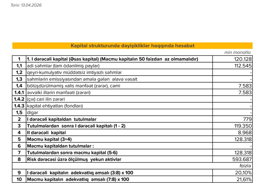 Hesabat dövrünün nəticələrinə əsasən, Bankın xalis mənfəəti ötən ilin müvafiq dövrü ilə müqayisədə 35%-dən çox artaraq 3 milyon 272 min manat təşkil edib. Bu artım Bankın əməliyyat səmərəliliyinin yüksəlməsi və gəlirlilik göstəricilərinin yaxşılaşması ilə müşayiət olunub.