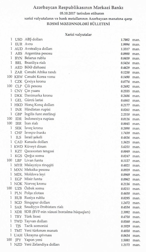 Oktyabrın 5-nə Mərkəzi Bankın açıqladığı rəsmi Dollar/manat məzənnəsi Oktyabrın 4-ü ilə müqayisədə dəyişməyərək 1,7002 manat olub, Avro/manat məzənnəsi isə 1.9994 manata düşüb.