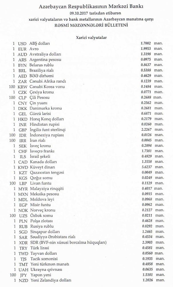Oktyabrın 6-da rəsmi olaraq 1 dollar 1,7002 manata, 1 avro isə 1.9891 manata, 1 Rubl 0,0294 manata bərabər idi.