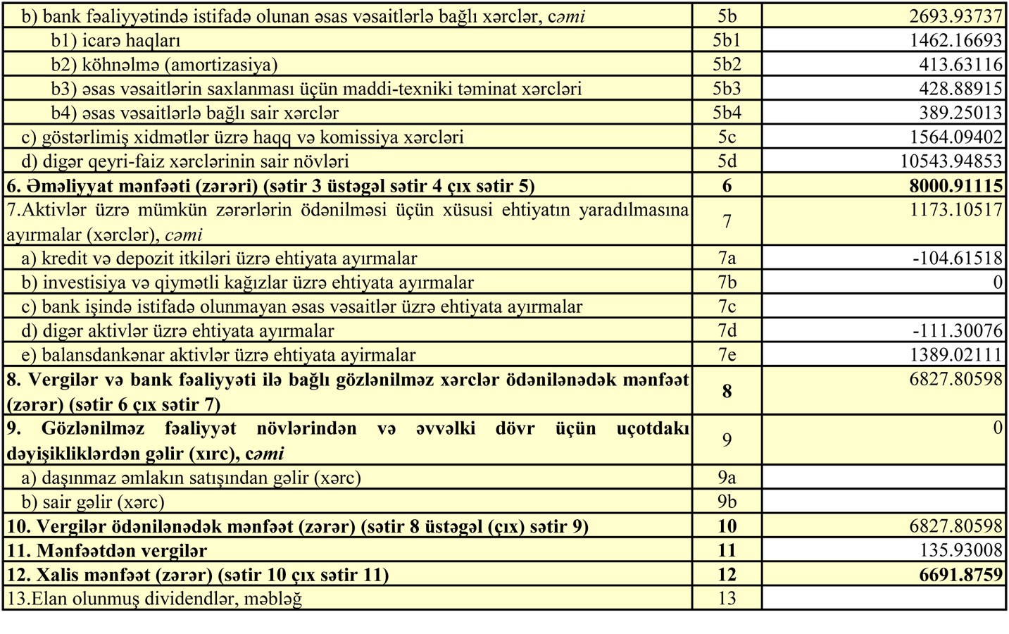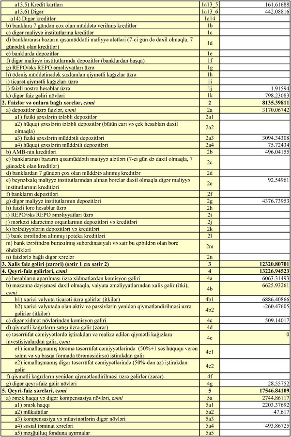 9 ayda Bankın faiz gəlirləri 20 milyon 456,2 min manat, qeyri-faiz gəlirləri isə 13 milyon 226.94 min manat təşkil edib. Qeyri-faiz gəlirlərinin 6 milyon 886 min manatı valyuta ticarətindən daxil olub.