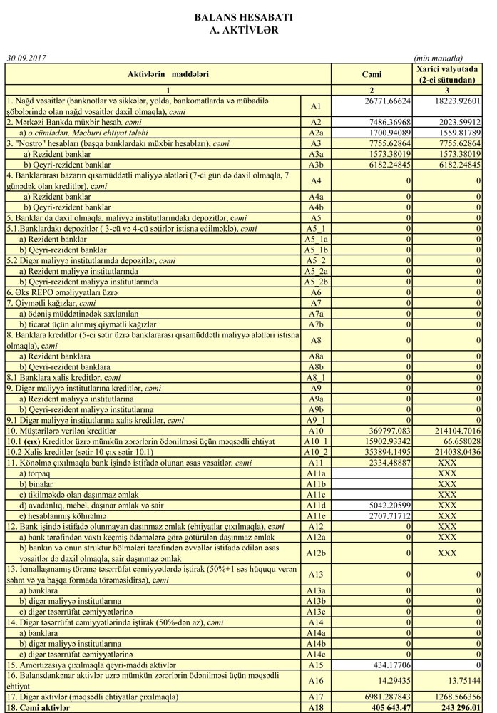Son 9 ayda müştrilərə verilən kreditlər 388 milyon 332.7 min manatdan 369 milyon 797 min manata geriləyib. Bankda depozitlər isə cüzi - 170 milyon 44.9 min manatdan 170 milyon 980.2 min manata qalxıb. Əhalinin əmanətləri (fiziki şəxslərin müddətli depozitləri) isə 120 milyon 381 min manatdan 102 milyon 97 min manata düşüb.