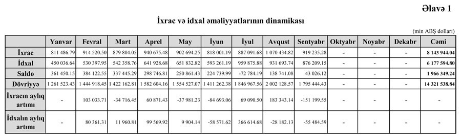 Sentyabrda ixrac 919 milyon 235 min dollar, idxalı isə 876 milyon 209 min dollar təşkil edib. Avqustda ixrac 1 milyard 70 milyon 434 min dollar, idxal isə 931 milyon 693.74 min dollar təşkil etmişdi.