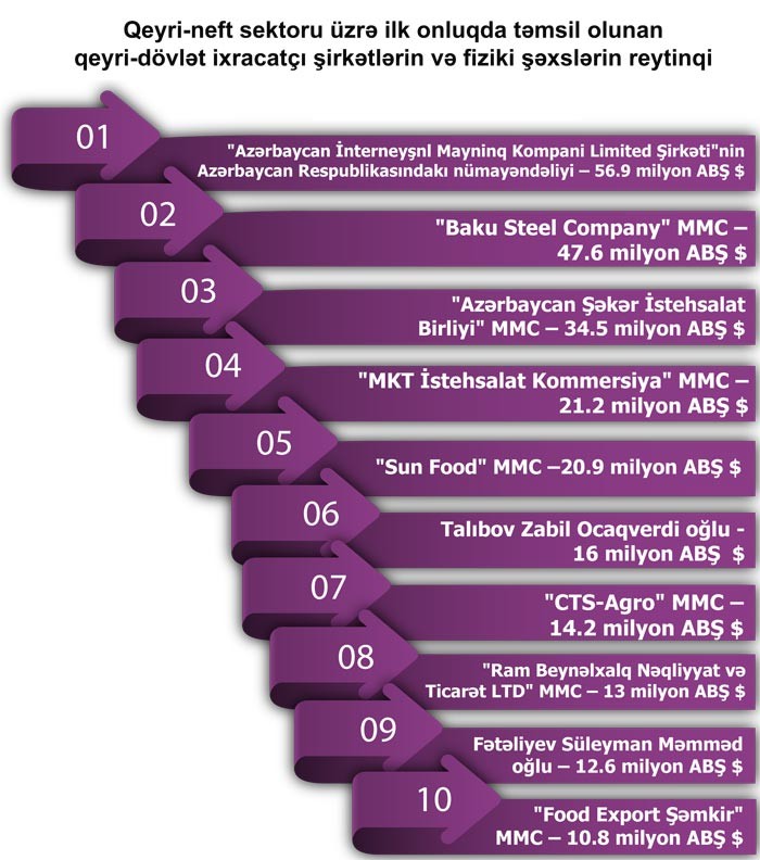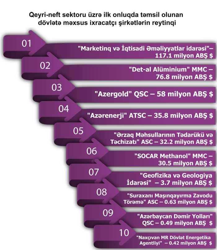Qeyri-neft sektoru üzrə ixrac əməliyyatlarında iştirak edən dövlətə məxsus şirkətlərin siyahısında isə ilk onluqda “Marketinq və İqtisadi Əməliyyatlar idarəsi”, “Det-al Alüminium” MMC, “Azergold” QSC, “Azərenerji” ATSC,”Ərzaq Məhsullarının Tədarükü və Təchizatı” ASC, “SOCAR Methanol” MMC, “Geofizika və Geologiya İdarəsi”, “Suraxanı Maşınqayırma Zavodu Törəmə” ASC, “Azərbaycan Dəmir Yolları” QSC və “Naxçıvan MR Dövlət Energetika Agentliyi” təmsil olunurlar.