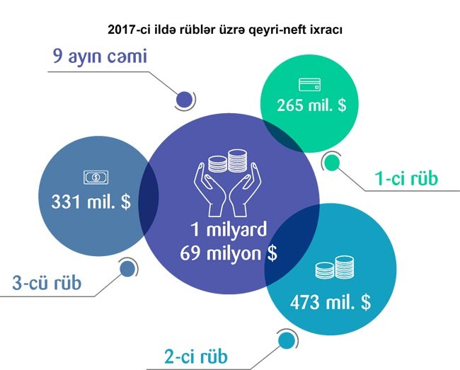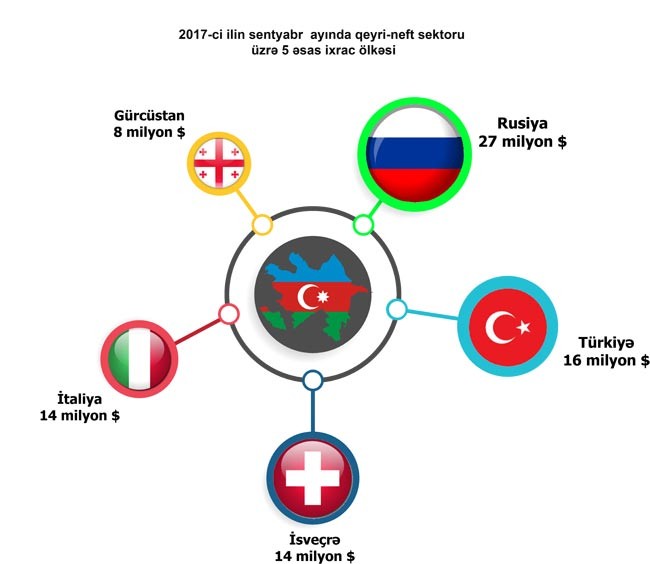 2016-cı ilin müvafiq dövrü ilə müqayisədə 2017- ci ilin 9 ayında qeyri-neft sektoru üzrə ixrac 25 faiz həcmdə artıb. Cari ilin 9 ayı ərzində qeyri-neft məhsullarının ixrac edildiyi ölkələrin siyahısında Rusiya liderliyi qoruyub. Dövlət Gömrük Komitəsinin məlumatına görə, 2017-ci ilin 9 ayı ərzində bu ölkəyə 366 milyon ABŞ dolları dəyərində ixrac olmuşdur. Növbəti yerləri isə Türkiyə (223 milyon ABŞ dolları), Gürcüstan (99 milyon ABŞ dolları), İsveçrə (98 milyon ABŞ dolları) və Türkmənistan (44 milyon ABŞ dolları) bölüşür.