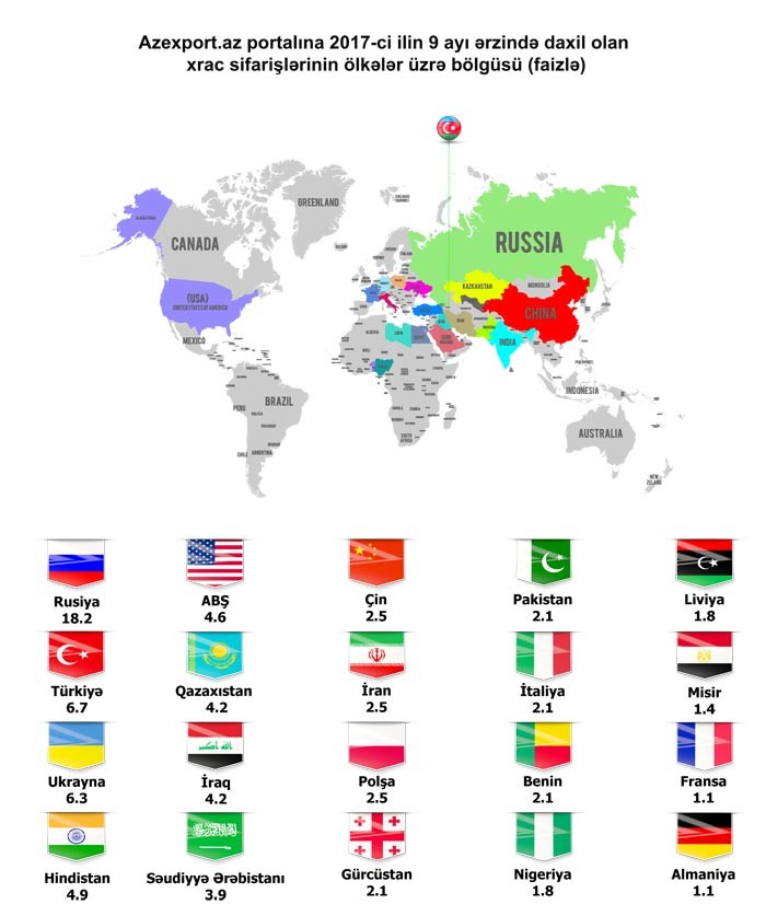 Azexport.az portalına daxil olan ixrac sifarişlərinin ilk beşliyində Rusiya (18.2%) ilə yanaşı Türkiyənin (6.7%), Ukraynanın (6.3%), Hindistanın (4.9%) və ABŞ-ın (4.6%) adı var. Sentyabr ayında diqqət çəkən məqamlardan biri Hindistandan daxil olan ixrac sifarişlərinin artmasıdır. Ötən ayda daxil olan sifarişləri məhsullar üzrə təhlil etdikdə məlum olur ki, sentyabr ayında ən çox ixrac sifarişi fındıq ləpəsinə, almaya, xiyara, kartofa, sarımsağa, şəraba və s. mallara daxil olub. Qırğızıstan Respublikasından pambıq yağına daxil olan sifariş həcmi böyük olduğu üçün yerli şirkətlər onu ancaq pambıq yığımı tam başa çatandan sonra qarşılaya biləcəklərini bildiriblər. Digər sifarişlər də Azexport.az portalının komandası tərəfində müvafiq yerli istehsalçılara yönəldilib.