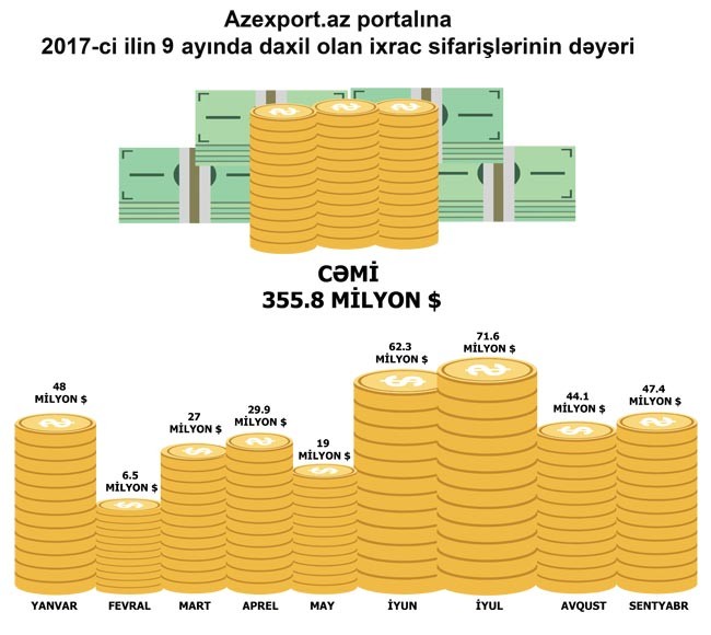 “İxrac İcmalı”nda 2017-ci ilin 9 ayı ərzində Azexport.az portalına daxil olan ixrac sifarişləri barədə də məlumat verilib. Göstərilib ki, 9 ayı ərzində dünyanın 60 ölkəsindən 355.8 milyon ABŞ dolları məbləğində ixrac sifarişləri daxil olmuşdur. Azexport.az portalına 2017-ci ilin sentyabr ayında daxil olan ixrac sifarişlərinin dəyəri isə 47.4 milyon ABŞ dolları təşkil edib.