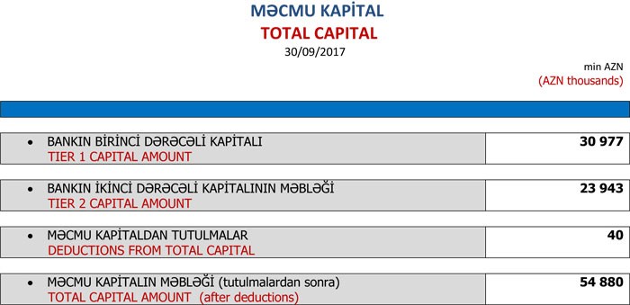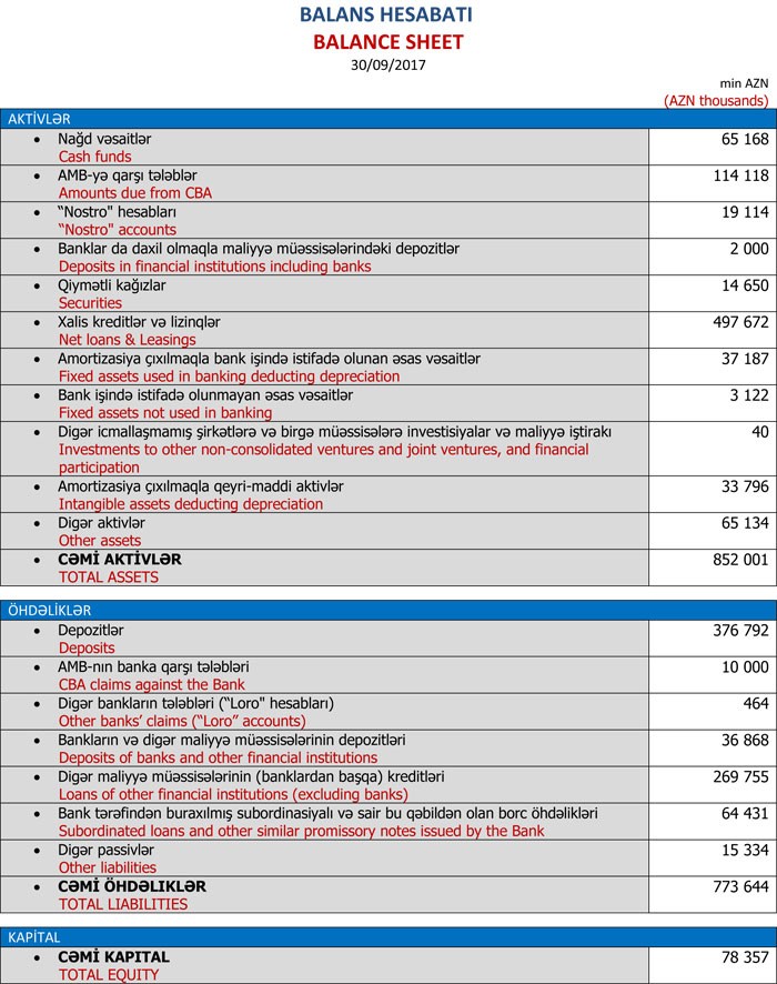 Bank 2016-cı ilin sonunda 1 milyard 58 milyon 871 min manat cəmi aktivlərə, 1 milyard 6 milyon 411 min manat cəmi öhdəliklərə və 52 milyon 460 min manat cəmi balans kapitalına malik idi.