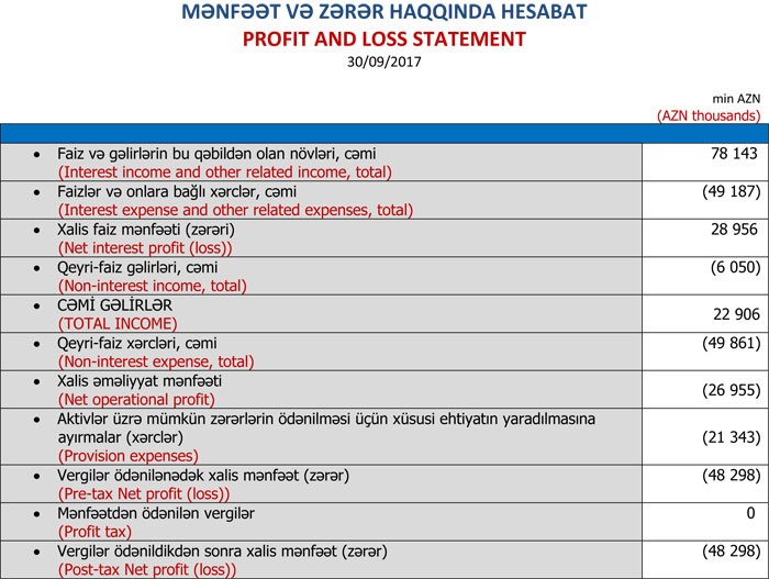 2017-ci ilin yanvar-sentyabr dövründə “AccessBank”ın faiz gəlirləri 78 milyon 143 min manat təşkil edib. Bank gəlirindən, aktivlər üzrə mümkün zərərlərin ödənilməsi üçün xüsusi ehtiyatın yaradılmasına 21 milyon 343 min manat ayırıb.