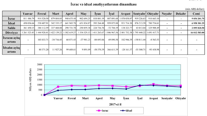 2017-ci ilin 10 ayı ərzində (yanvar-Oktyabr) Azərbaycanın ticarət əməliyyatlarının həcmi 16 milyard 12 milyon 583.00 min ABŞ dolları təşkil edib.