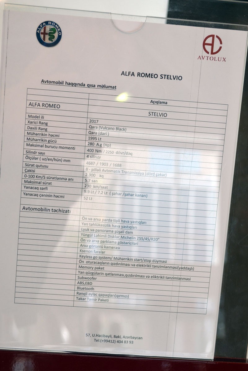Qeyd edək ki, “Alfa Romeo” brendinin Azərbaycanda rəsmi dileri "Autolux Azerbaijan" şirkətidir. Şirkətin satış mərkəzi Bakıda Ü. Hacıbəyli, 57 C ünvanında yerləşir.