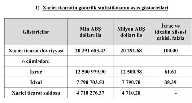 "Marja" Dövlət Gömrük Komitəsinə istinadən xəbər verir ki, o cümlədən, idxal əməliyyatları üzrə 7 milyard 790 milyon 703.53 min ABŞ dolları, ixrac əməliyyatları üzrə 12 milyard 500 milyon 979.90 min ABŞ dolları dövriyyə qeydə alınıb.