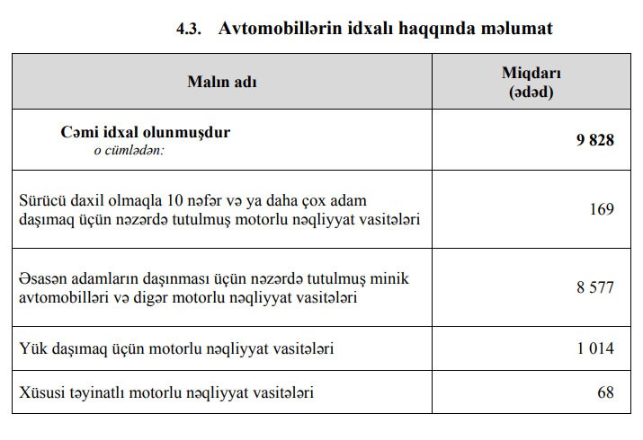 Minik avtomobillərinin idxalı isə 4 194 ədəddən 8 577 ədədə qalxıb.
