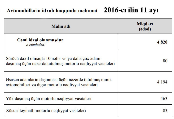 2017-ci ilin 11 ayı ərzində Azərbaycana 9 828 ədəd nəqliyyat vasitəsi gətirilib.